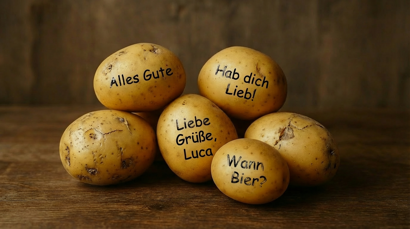 Deine Botschaft, handbeschriftet auf echter Kartoffel. Auf Wunsch anonym. Du gibst Text und Adresse ein – wir verpacken und versenden an deine Wunschadresse.